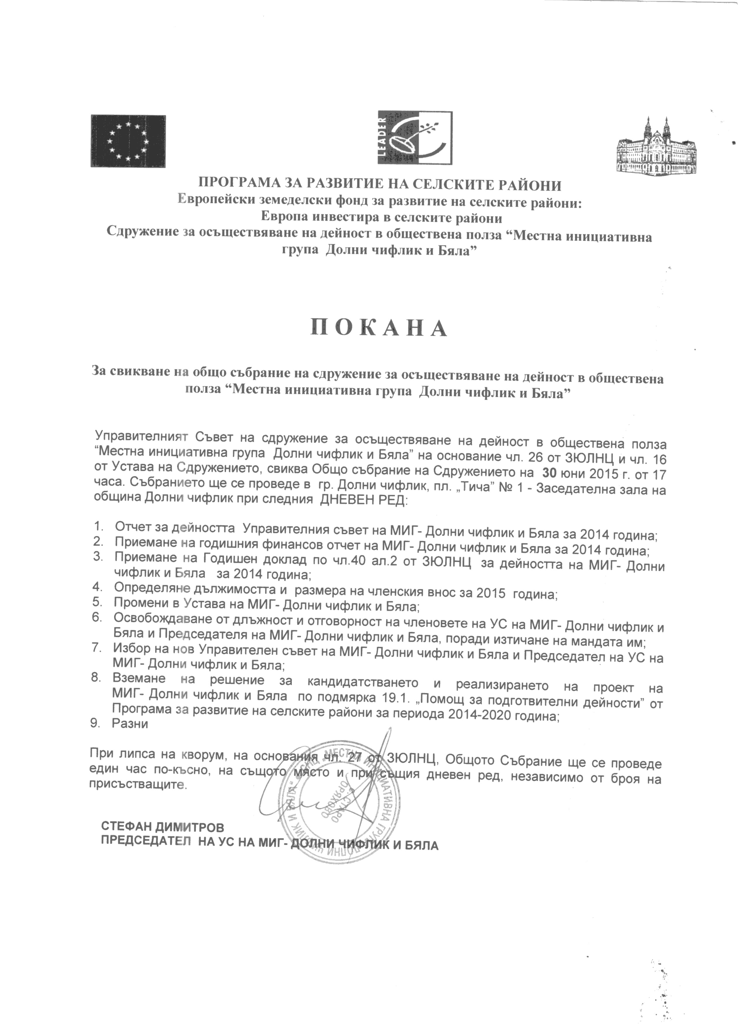 Покана за свикване на заседание на Общо събрание на Сдружение с нестопанска цел "Местна инициативна група - Долни чифлик и Бяла"